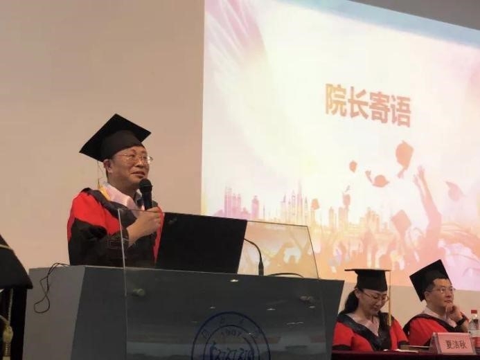 伟德国际victor1946院长刘日明教授代表学院致辞。他祝贺85位学子圆满完成学业,顺利毕业;对全院教师的教育之情表示感谢;对家长的养育之恩表达谢意;为全体毕业生四年中取得的众多成绩以及给学院带来的荣誉表达敬意。刘日明院长向全体毕业生提出新时代的希冀,希望人文学子要有应对技术和未来社会的勇气和能力;要有时代担当,要立足时代,引领时代风气,把自己的成长与时代发展和中华民族伟大复兴的建设重任结合起来;要继续养成读书思考的习惯,夯实人文知识基础,开拓视野;要正确处理好物质生活和精神生活的关系,要有精神追求,要有理想信念,不能被物质利益奴役和异化,要志存高远,勇于创新,牢记历史使命,要传承和践行好"人文化成、同济天下"的院训和精神。