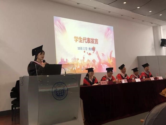 来自艺术与文化产业管理系的魏宛辰同学,代表2019届毕业生向各位老师、家长、同学们分享感悟,表达感恩。她在离开之前表达了自己对每一位老师,所有工作人员,父母和同学们的感谢。更感谢同济给了所有人面对未来的勇气。最后,她祝大家毕业快乐。