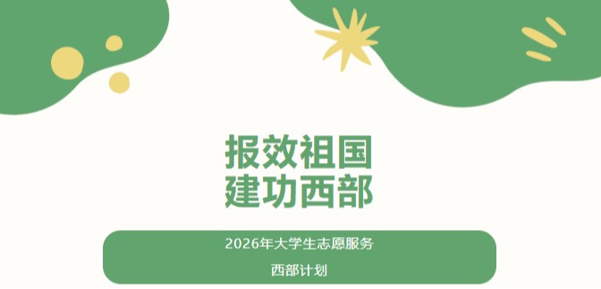 2026年大学生志愿服务西部计划报名通道已正式开启! 这是一份来自祖国西部的邀约,期待有理想、敢担当、能吃苦、肯奋斗的你,能接过前辈的接力棒,在辽阔的西部大地写下属于自己的青春故事。